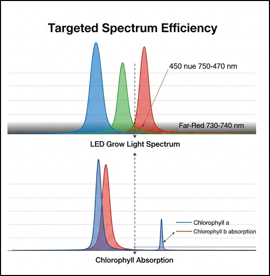 Blue, green, red, deep-red, and far-red wavelengths are tuned to plant biology, ensuring nearly every photon contributes to photosynthesis.